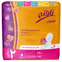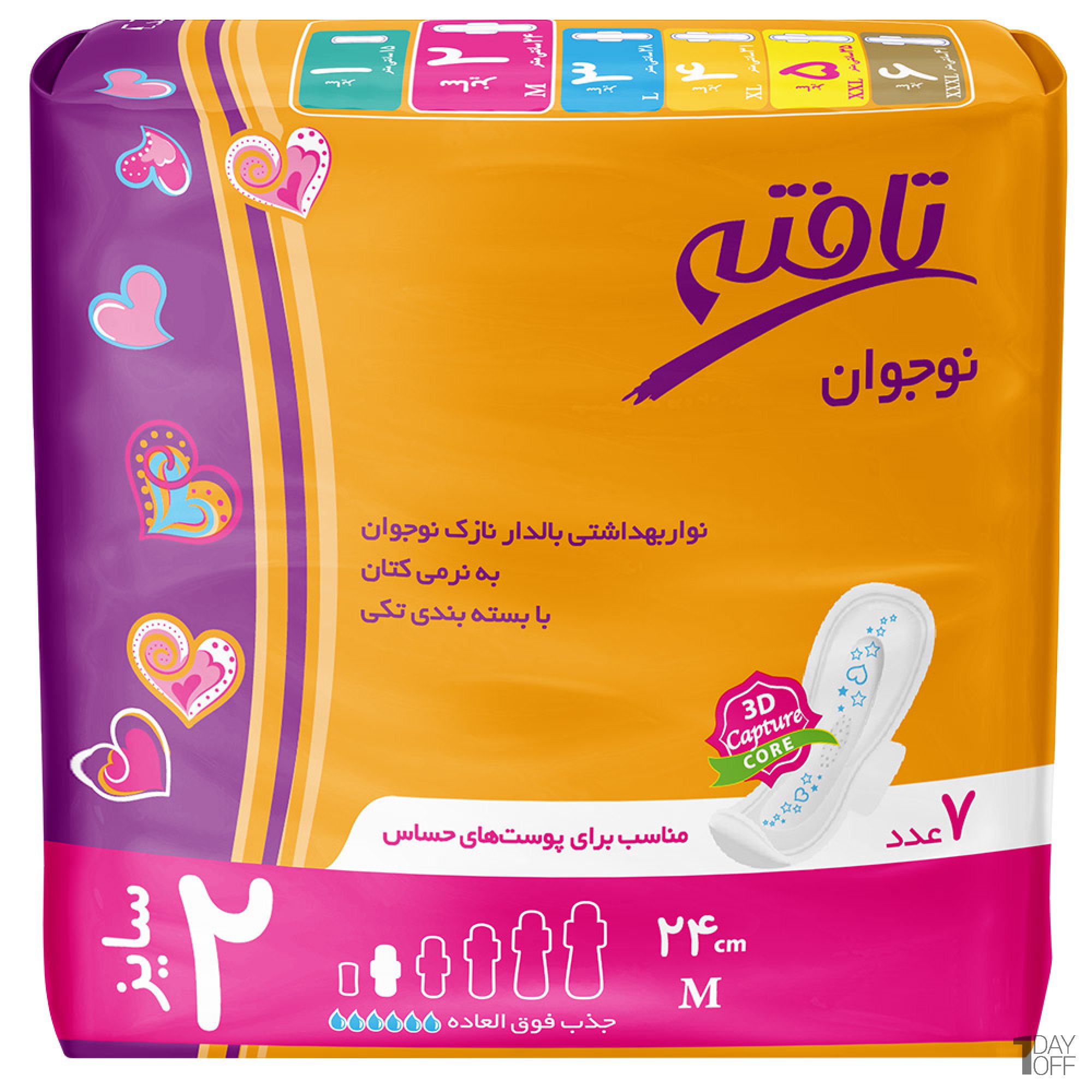 نوار بهداشتی بالدار نازک نوجوان تافته حاوی پودر جاذب بو و آنتیباکتریال است و از ایجاد حساسیت در افراد با پوست حساس پیشگیری میکند. جنس رویه این نوار بهداشتی معمولی است و چسب به کار رفته آن با چسبندگی مناسب مانع از جابهجایی نواربهداشتی هنگام استفاده میشود. سایز این نواربهداشتی کوچک است و در بستهی 7 عددی عرضه شده است.